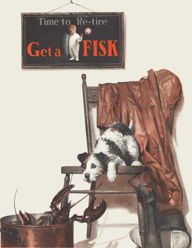 This is a reprint of a Vintage Fisk Tire Advertisement Reprint Terrier Dog and Lobster by artist Leslie Thrasher. It is new and in mint condition, printed on Polaroid premium gloss paper. Ideal for framing with a tiny 1/16 inch white border. We have reproduced the cover for dog lovers everywhere. This is a reproduction of the original size of the magazine 8.5 x 11″.