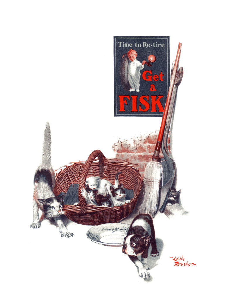 This is a reprint of a Vintage Fisk Tire Advertisement Reprint of a Boston Terrier Dog, a Momma Cat and her Kittens by artist Leslie Thrasher. It is new and in mint condition, printed on Polaroid premium gloss paper. Ideal for framing with a tiny 1/16 inch white border. We have reproduced the cover for dog lovers everywhere. This is a reproduction of the original size of the magazine 8.5 x 11″.